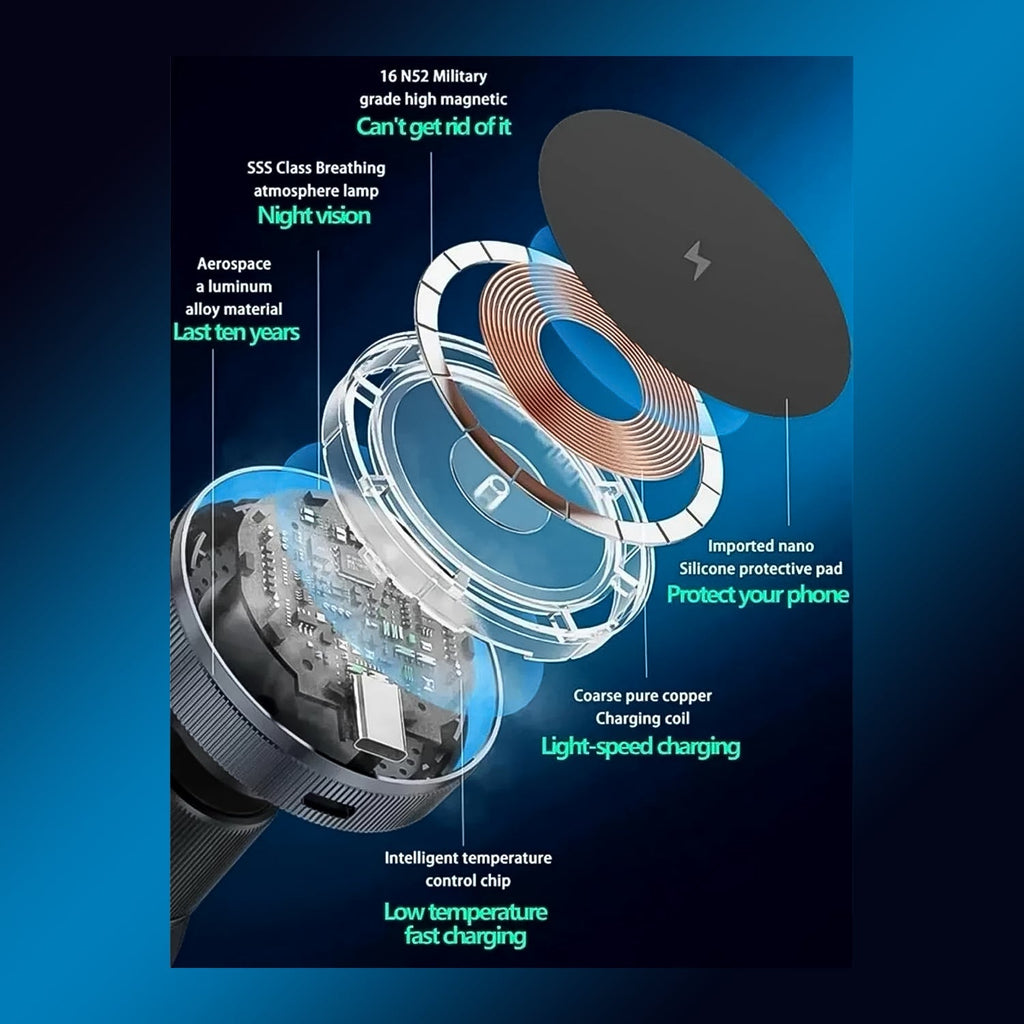 - Music Reactive Lighting with the for Magnetic Phone Mount Wireless Charger. As you drive, the atmospheric lighting responds to the rhythm and beats of your music. This creates a vibrant and dynamic visual experience, transforming your car into a moving light show. This inspiring feature makes the not just a car cell phone holder or a car charger for iPhone, but a unique gadget that adds a touch of fun and excitement to your car journeys.